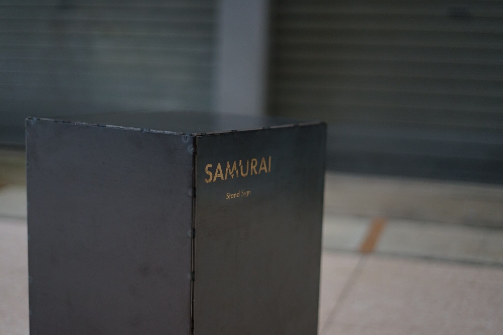 重厚な存在感を放つ、鉄製のキューブ型サイン。