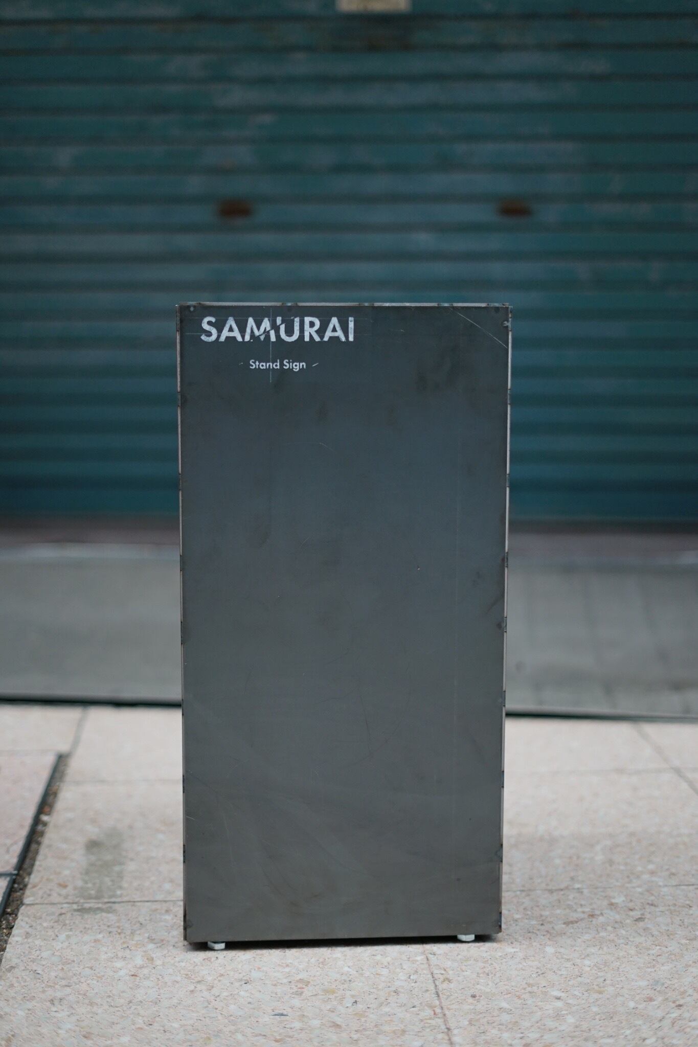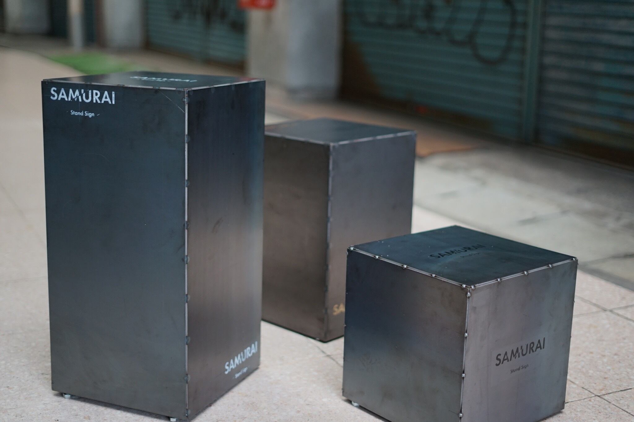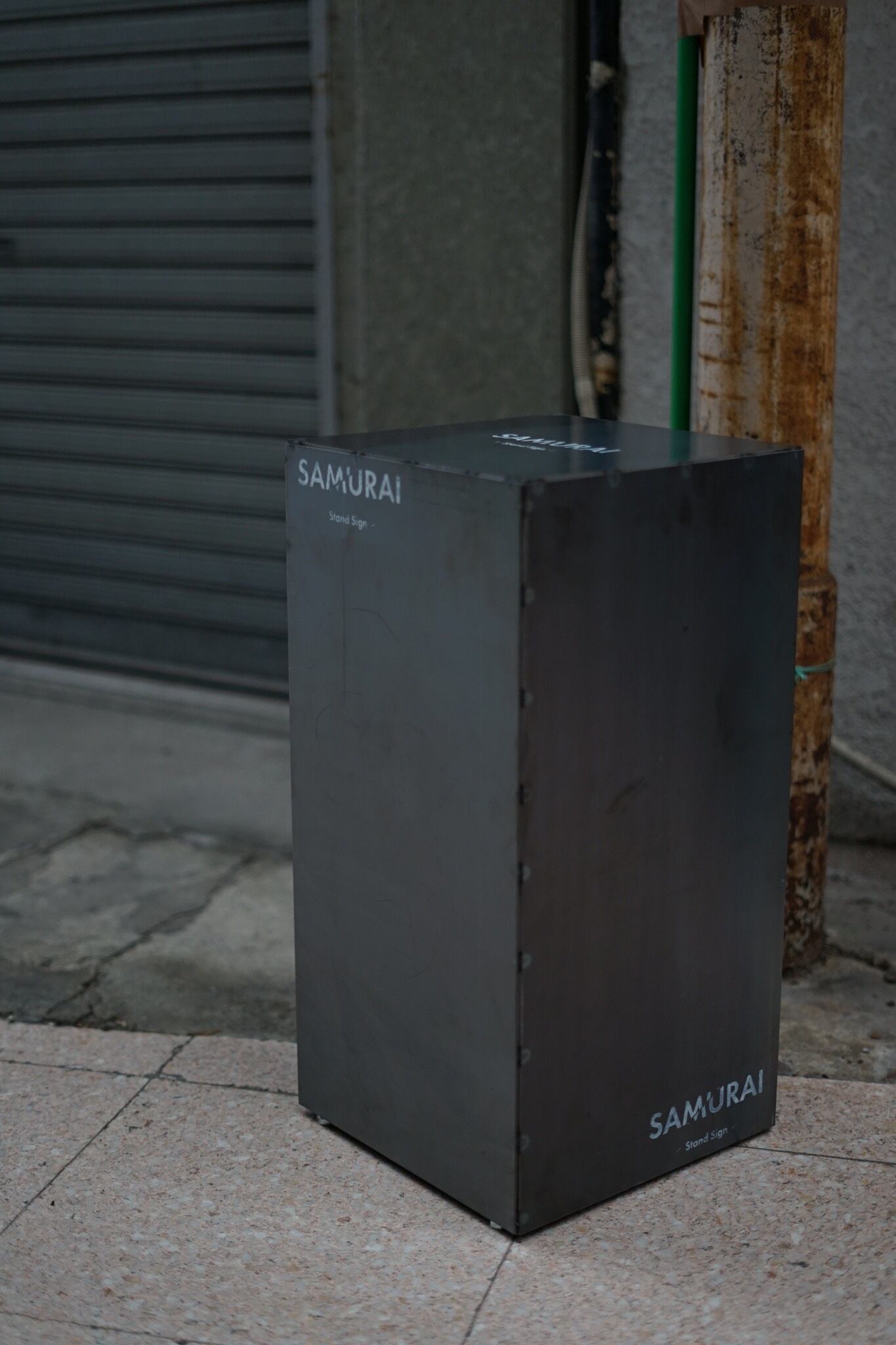 重厚な存在感を放つ、鉄製のキューブ型サイン。